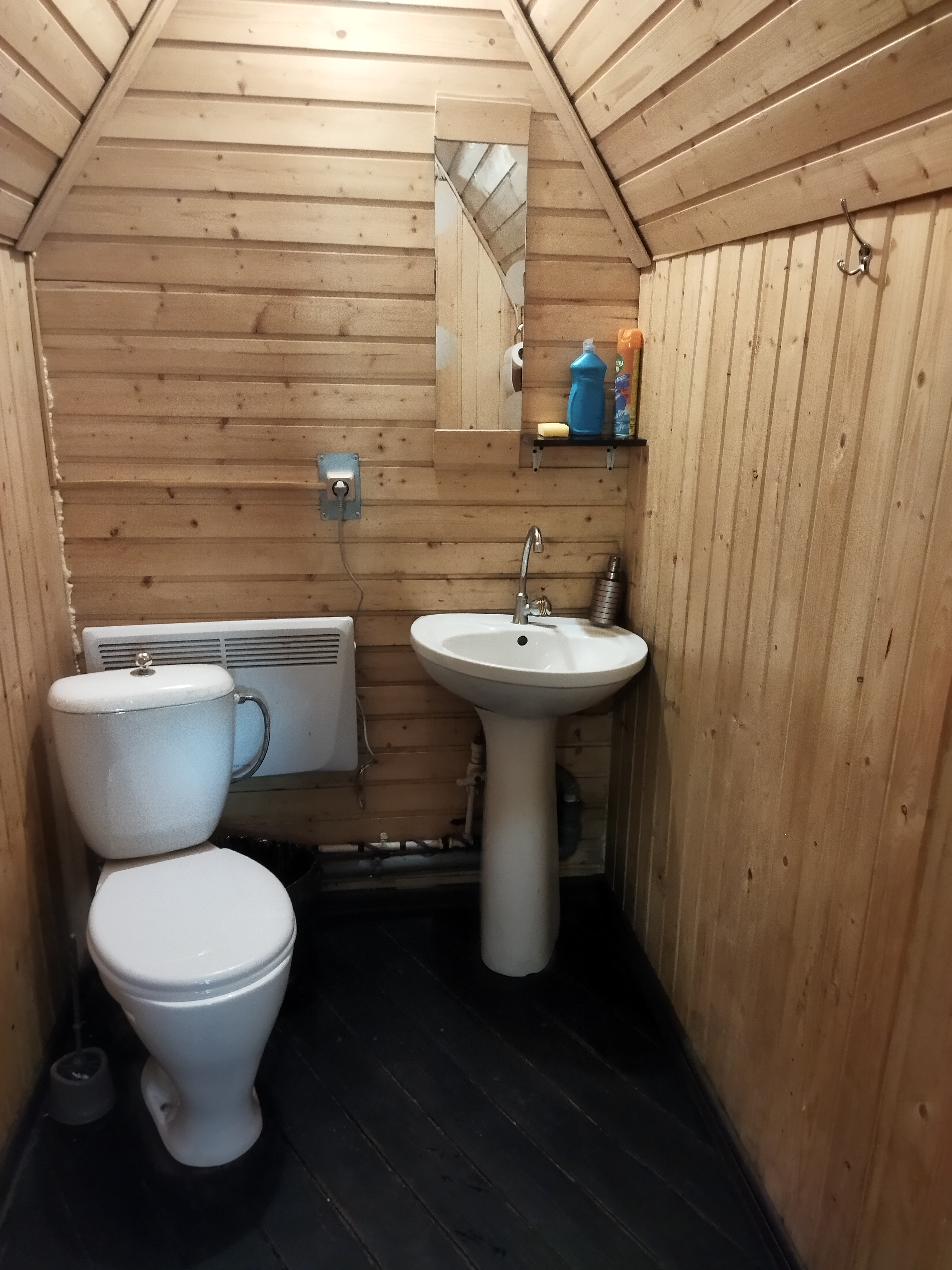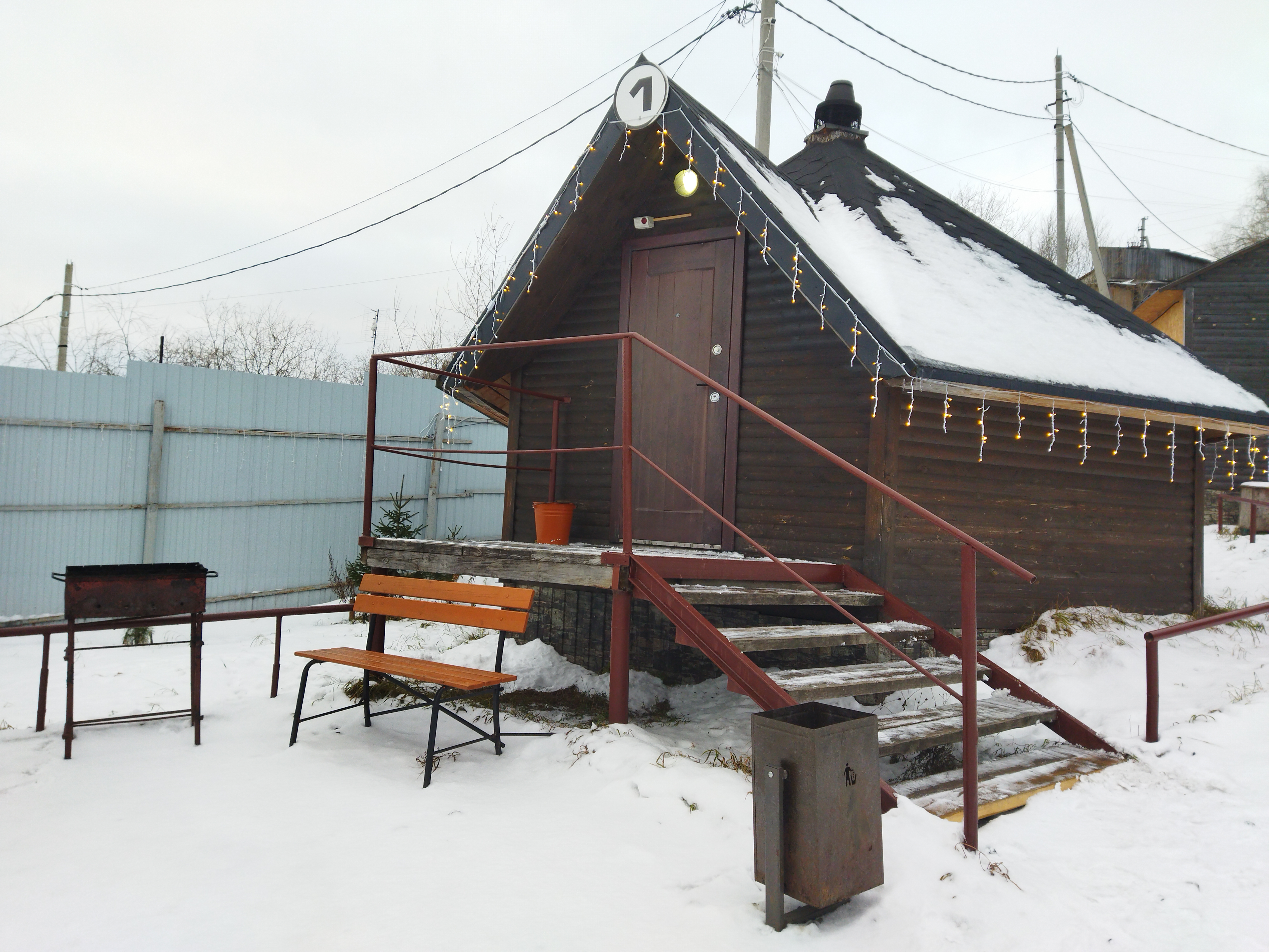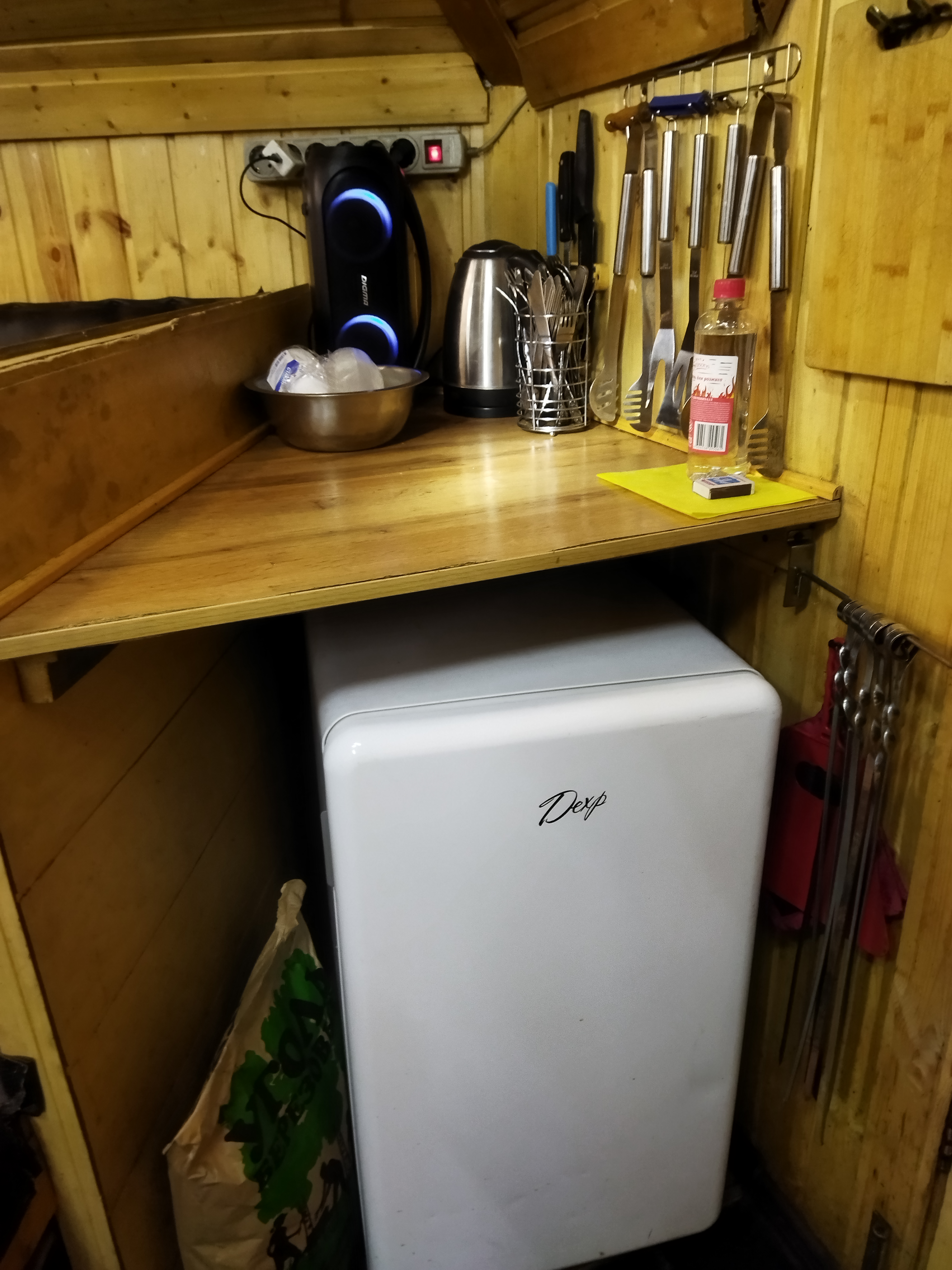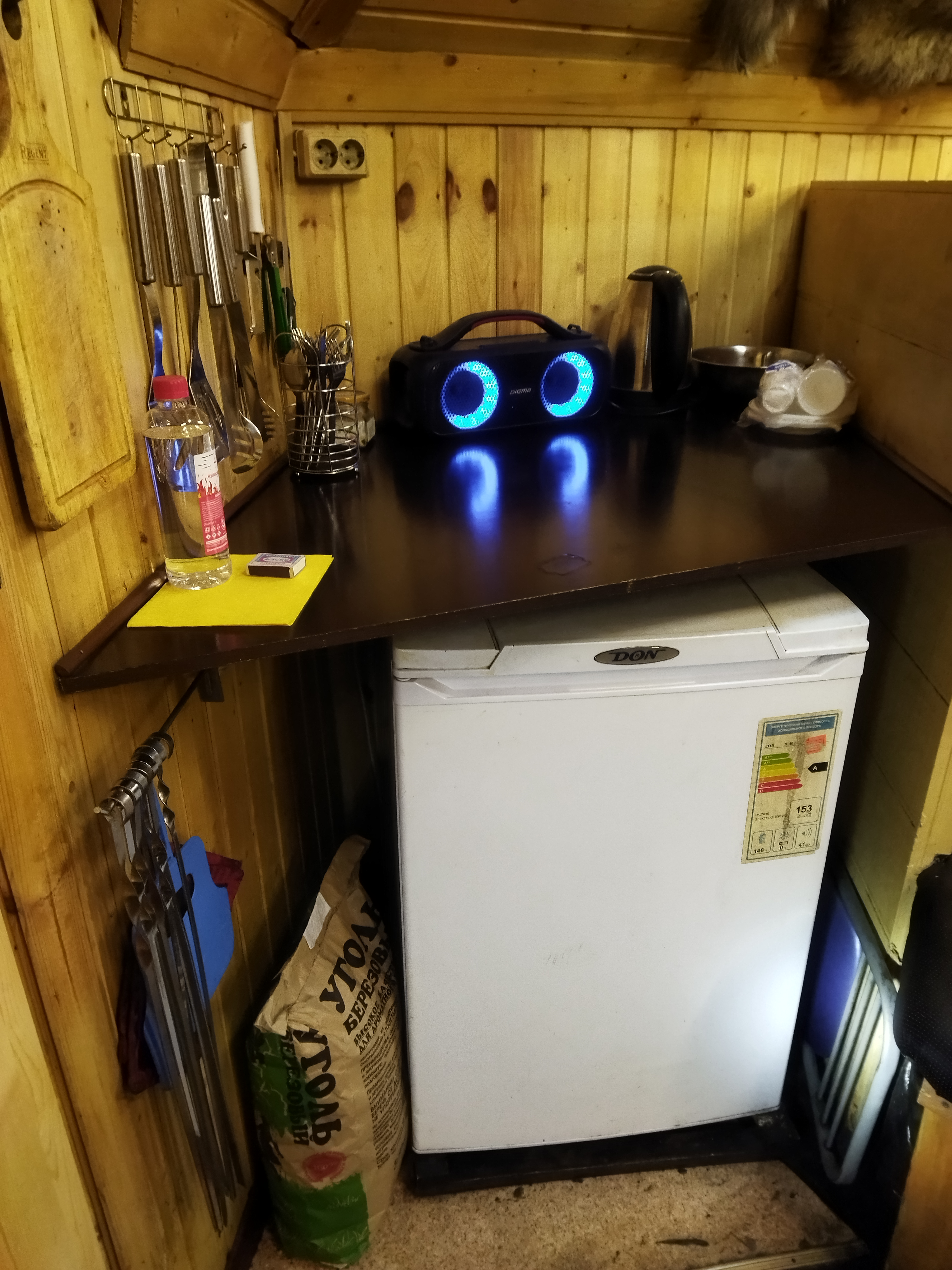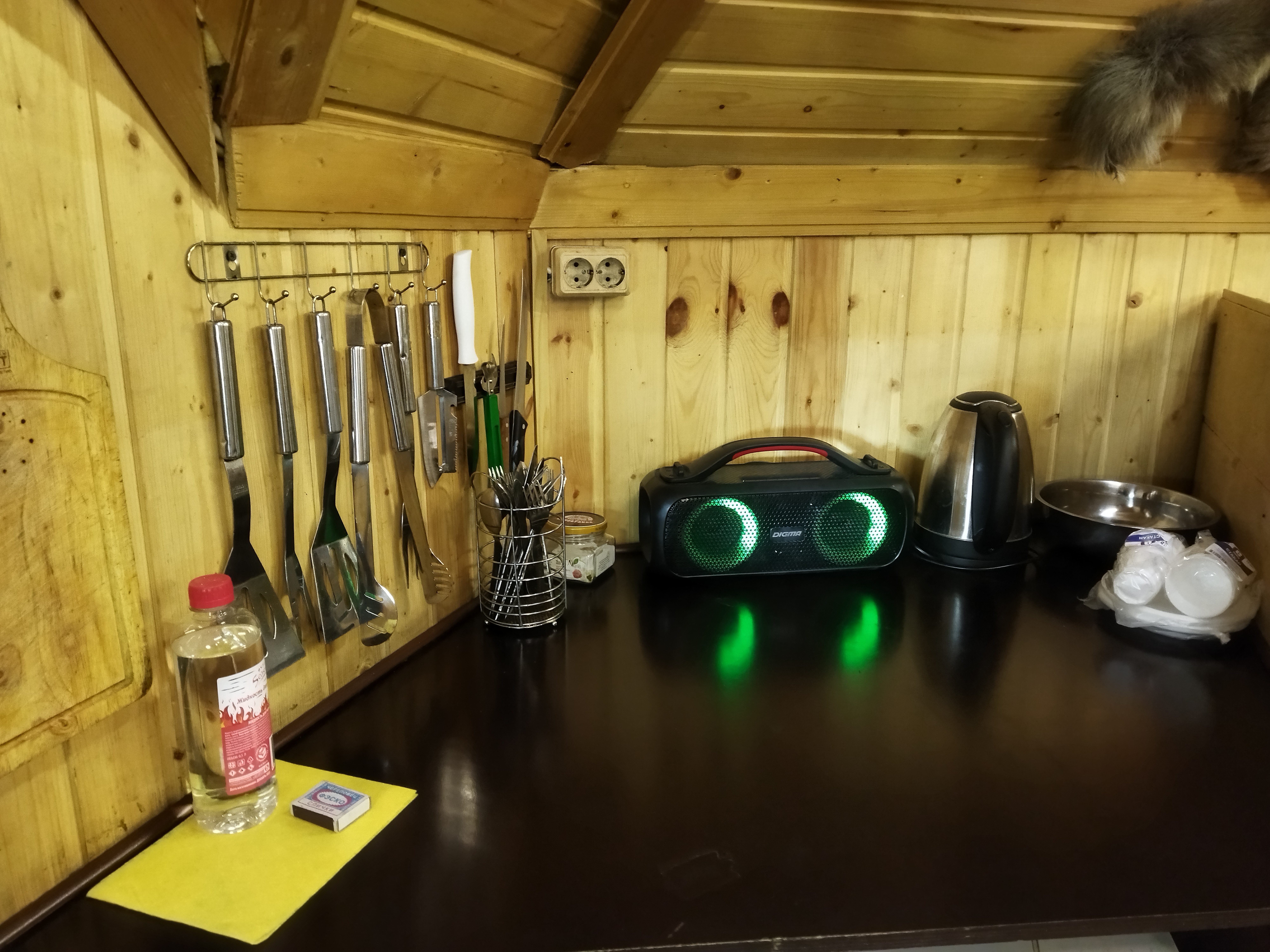 - В домике есть: островное гриль - барбекю, круглый стол и диван, зона кухни, санузел, музыкальная магнитола, холодильник, электрочайник, дополнительный мангал на улице.
