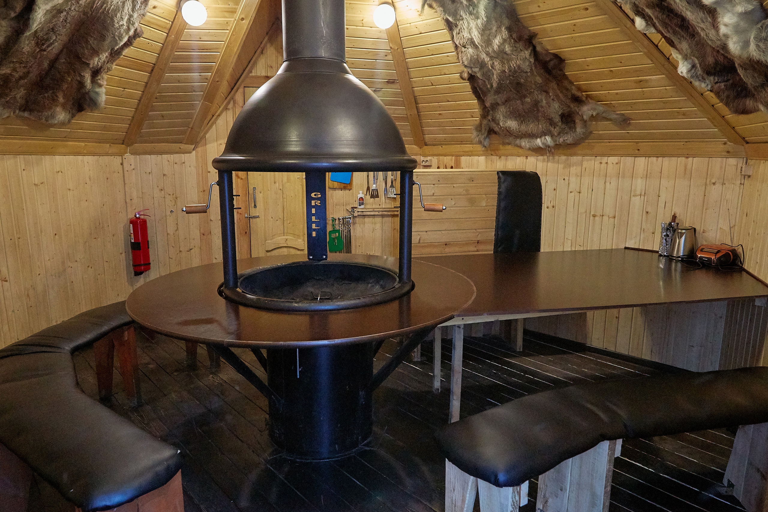 Домик оборудован дополнительным большим столом за которым может разместиться большая компания друзей. Вместимость до пятнадцати человек. Есть все необходимое для приготовления вкусного барбекю и отдыха, а интерьер украшен ямальскими аксессуарами.